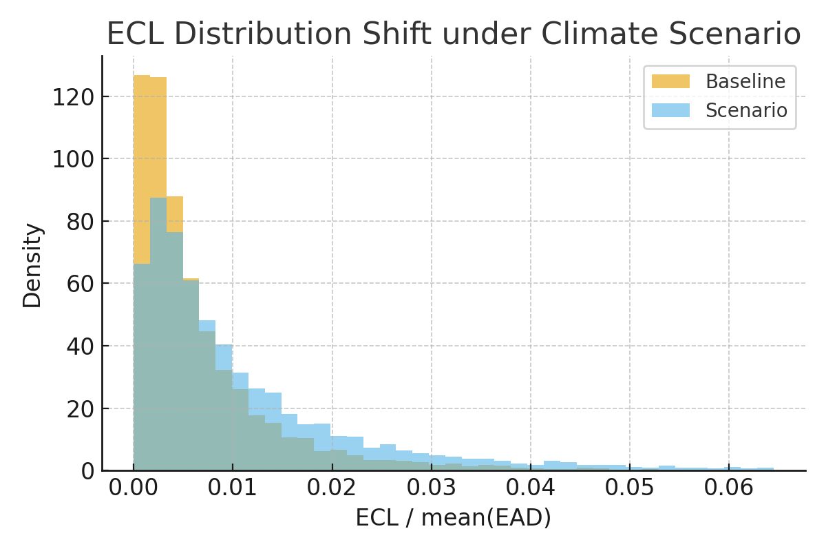 The illustrative simulation shows ECL rising as PD and LGD adjust for carbon intensity and hazard exposure. This demonstrates how banks’ expected credit losses can increase under NGFS disorderly-transition scenarios.