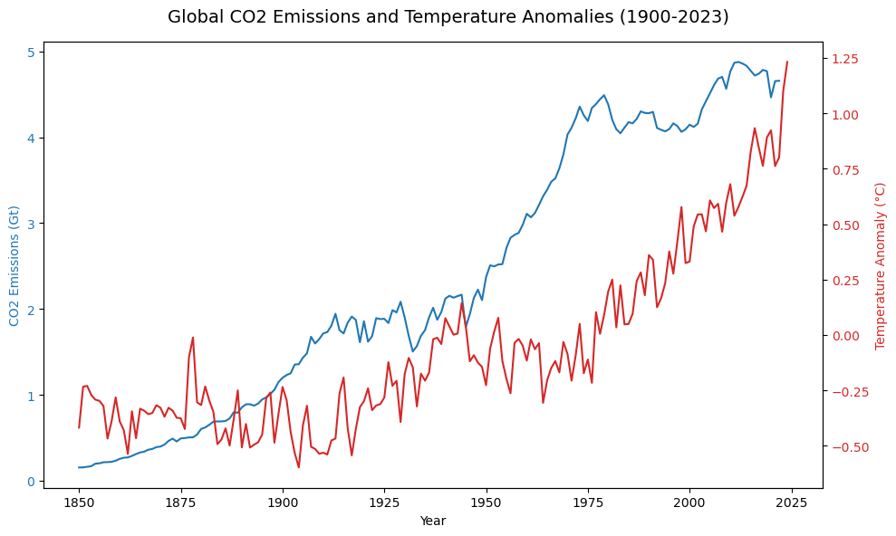 As the figure below reveals, CO₂ is the principal driver behind this warming. It shows a compelling link where the sharp, sustained increase in anthropogenic CO₂ emissions (blue line) is mirrored by the accelerating rise in the global temperature anomaly (red line). This correlation confirms the foundational climate science: increased human-caused CO₂ traps more heat, enhancing the greenhouse effect, and is the primary forcing agent responsible for the dangerous warming trend now observed globally.