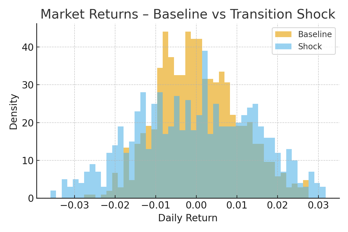 The figure below illustrates how left-tail risk increases under a transition shock. This trend corresponds with market behavior following abrupt policy or energy shocks.
