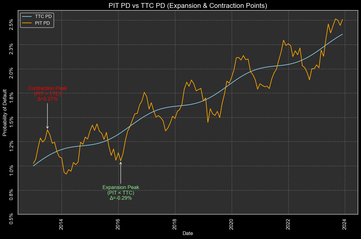 Apply the probability-weighted average of these scenarios to derive the final PIT PD for ECL purposes.